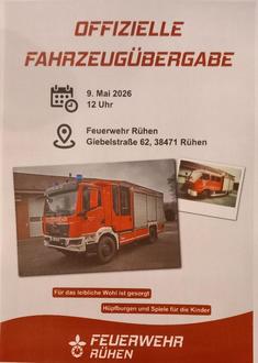 Die Freiwillige Feuerwehr Rühen lädt alle Rühenerinnen und Rühener zur offiziellen Übergabe unseres neuen HLF ein. Feiert mit uns am 09.05.2026 ab 12:00 Uhr am Feuerwehrhaus.