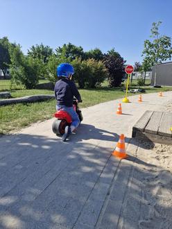 Wir haben zusammen ein Musik- Stopp Spiel gespielt: laute Kindermusik motivierte die Kinder, flott zu fahren, aber wenn die Musik ausging, musste eine schnelle Reaktion gezeigt werden: alle mussten sofort anhalten- für ein imaginäres Kind, was auf die Fahrbahn gelaufen kam.