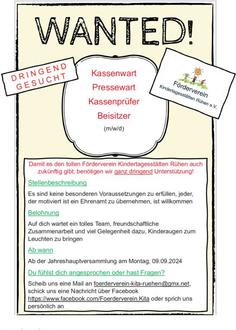 Zur nächsten Jahreshauptversammlung am 09.09.2024, 17:30 Uhr in der Kita „Zum Regenbogen“ werden folgende Ämter frei und müssen neu besetzt werden: