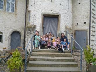 Dort haben wir in gemütlicher Atmosphäre bei herrlichem Wetter gemeinsam gepicknickt. Nette Gespräche ergaben sich, die Kinder konnten anschließend mit Steckenpferden reiten und ihre im Vorfeld gebastelten Bienen fliegen lassen. Der Höhepunkt war dann die Möglichkeit für ganz Mutige, auf den Burg-Turm zu steigen. Und man staune- alle waren mutig und das wurde mit einem Eis belohnt.