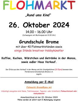 Die Anmeldung erfolgt per E-Mail an flohmarkt-brome@gmx.net. Unbedingt anzugeben sind: Name, Telefonnummer, Tapezier- oder Schultisch und Flohmarktstand oder Hobbykünstler. Der Anmeldeschluss ist der 20. Oktober 2024.