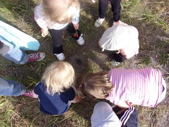 Als wir die Feldmark erreicht haben, durften alle Kinder selber laufen. Und die Kinder entdecken so vieles, was uns Erwachsenen gar nicht mehr auffällt. Da lohnt es sich wirklich, die Welt wieder durch Kinderaugen zu sehen! Alles ist für die Kinder spannend, jeder Stein musste umgedreht werden. Eicheln wurden gesammelt, die letzten Löwenzahnblüten mitgenommen und Gräser gepflückt. Wir lernten Kamille und Spitzwegerich kennen. Leuchtend rote Hagebutten wuchsen am Wegesrand. Und wir sangen passend dazu „Ein Männlein steht im Walde“