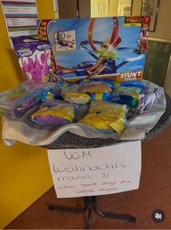 Für große Freude sorgte eine Überraschung vor der Gruppentür: Der Weihnachtsmann hatte Geschenke für die Kinder abgelegt. Mit strahlenden Augen entdeckten sie unter anderem eine neue Hot-Wheel-Bahn sowie Kinetic Sand.