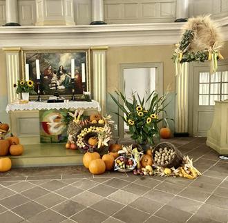 Ein herzlicher Dank an alle Spender, die es möglich gemacht haben, den Altar so wunderschön zu schmücken: den Landwirten für die Früchte und Blumen, Bäckerei Twelkemeier für das extra gestaltete Brot, der Jungen Gesellschaft Tülau für die Erntekrone und den Bäckerinnen für den leckeren Blechkuchen.