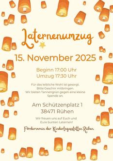 Am 15. November 2025 lädt der Förderverein der Kindertagesstätten Rühen auch dieses Jahr wieder zu einem stimmungsvollen Laternenumzug ein. Die Veranstaltung beginnt um 17:00 Uhr, wobei der eigentliche Umzug um 17:30 Uhr startet. Der Treffpunkt ist der Schützenplatz 1, 38471 Rühen.
