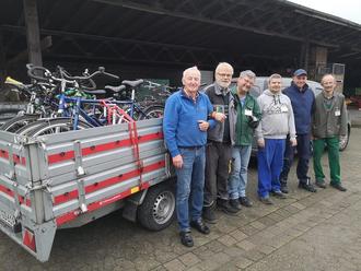 Horst Trzonnek (auf dem Foto links), Werkstattleiter der Fahrradwerkstatt im Camp Lessien und André Bühring (2. von rechts) fuhren am 11. Oktober zur Butting Akademie nach Knesebeck. Hier erwartete man die beiden schon, um Ihnen wieder wie jedes Jahr Fahrräder für die Flüchtlinge zu übergeben. Auf dem Foto sieht man Ralf Lampe, 2. von links, Leiter der Integrationswerkstatt und seine Mitarbeiter.