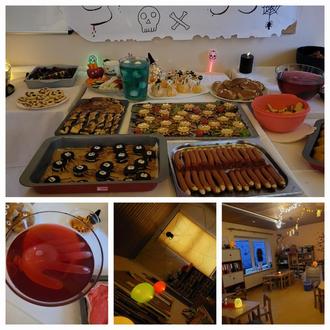 Mit viel Fantasie wurde aus den Gruppenräumen in kurzer Zeit ein Gruselparadies. Fledermäuse, Spinnennetze und Geister schmückten die Räume, während die Kinder gemeinsam mit ihren Eltern ein buntes Gruselbuffet vorbereiteten. Dank zahlreicher Spenden der Eltern gab es allerhand Leckereien – von Gespenster-Laugenbrötchen über Wackelpuddingaugen bis hin zu schaurig dekorierten Obstspießen.