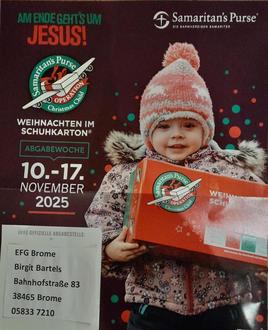 in die Ev. Freikirche nach Brome-Altendorf kommen. Wir wollen nach dem Gottesdienst mit vielen spannenden Informationen ab ca. 11 Uhr wieder gemeinsam die SchuhkartonGeschenke aus vielen zusammengetragenen wunderbaren Spenden individuell packen, um möglichst vielen Kindern eine unvergessliche Freude zu machen.