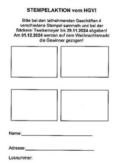 Bitte bei den teilnehmenden Geschäften 4 verschiedene Stempel sammeln und bei der Bäckerei Twelkemeyer bis 29.11.2024 abgeben! Am 01.12.2024 werden auf dem Weihnachtsmarkt
