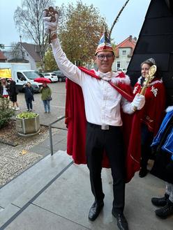 So konnte unser Moderator Udo alle zur Schlüsselübergabe einstimmen. Dann, um 16:11 Uhr war es soweit und unser Prinz Dirk erhielt aus den Händen vom Bürgermeister den „Schlüssel zum Rathaus“. Selbst das Wetter hat mitgespielt und schenkte uns „Freudentränen“.