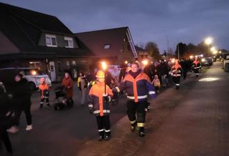 Eine bunte Lichterkette, eine Leihgabe von einer Elektrofirma, schmückte wieder das Außengelände. Um 16:30 Uhr trafen sich die Kinder mit ihren Eltern auf dem Außengelände der Kita. Nach einer Begrüßung, sangen die Kinder ihr neu eingeübtes Laternenlied „Lichterchen, komm tanz mit mir.“ Dann ging auch schon der Laternenumzug los. Für die nötige Sicherheit sorgte die Feuerwehr Brechtorf. Die Jugendfeuerwehr begleitete den Umzug mit Fackeln, was die Kinderaugen zum Staunen brachte. Musikalische Unterstützung beim Umzug, bekamen wir von 3 Trommlern des Schützenvereins Brome.