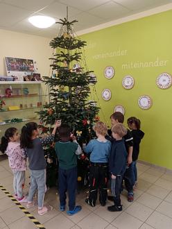Besonders schön erstrahlt dabei der große Weihnachtsbaum, den uns unser Förderverein kurzerhand und pünktlich zum 01. Dezember organisiert hat. Mit strahlenden Augen und einem stolzen Lächeln im Gesicht schmückten die Kinder den "größten und tollsten Tannenbaum, den sie je gesehen haben".