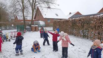 Ende November war es dann endlich so weit. Es fielen tatsächlich weise Flocken vom Himmel. Manchmal mehr, manchmal weniger und manchmal war es eine Mischung aus Schnee und Regen, stellten die Kinder fest. Die Kinder waren völlig aus dem Häuschen. Schon gleich um 8 Uhr wurden die ersten Anträge gestellt, um nach draußen zu gehen. Also wurde flott gefrühstückt, sich in eine Schneeoutfit geschmissen, mit Handschuhen bewaffnet das Außengelände unsicher gemacht. Der Versuch einen Schneemann zu bauen, funktionierte nur teilweise. Der Schnee ließ es noch nicht ganz zu. Oben auf der ersten Schicht war es ziemlich gefroren und darunter befand sich der Pulverschnee. Und Schwuppdiwupp, kamen die Kinder auf die Idee eine Schneeballschlacht zu machen Kreuz und Quer rannten alle durch die Gegend und jeder wollte jeden treffen aber bitte nicht selbst getroffen werden. Und als alle ziemlich erschöpft waren spielten wir noch ein Kreisspiel: „Im Garten steht ein Schneemann“.