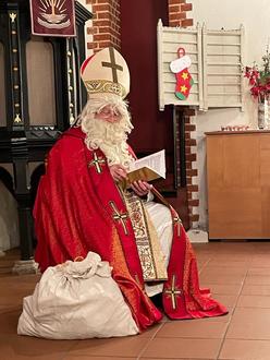 Und tatsächlich: am Nachmittag des 06. Dezember kam er in unsere St.-Michaelis-Kirche. Dort warteten rund 20 Familien mit 35 Kindern auf den besonderen Gast. Im Rahmen einer Nikolaus-Andacht, die musikalisch von Kerstin Grote und Katja Mosel gestaltet wurde, beschenkte der Heilige Nikolaus die Kinder mit kleinen Tüten und roten dekorierten Kerzen.