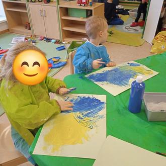 Eine gelbe Sonne als Gabeldruck, gelbe Prickelbilder führten die Mäuse immer weiter ins Reich der Farben. Kleisterbilder, auf denen die Kinder sehen konnten, was passiert, wenn Gelb und Blau oder Rot und Blau gemischt werden rundeten unser Programm ab.