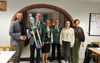 Die Würdenträger von links: Samtgemeindebürgermeister Wieland Bartels, Jens Barth mit dem Präsidentenpokal, Samtgemeindeschützenkönigin Tanja Böse, I. Ritter Silvestro Zammataro, II. Ritterin Anika Herhut und Bürgermeisterin Kerstin Keil