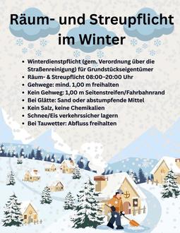 Mit dem Einzug des Winters ergeben sich bei Frost und Schneefall für die Kinder und auch Erwachsenen zwar viel Freude, für die Eigentümer der an öffentliche Straßen angrenzenden bebauten und unbebauten Grundstücke allerdings auch Pflichten. Dieses vornehmlich im Blick auf die Straßenreinigung, die in den Wintermonaten hauptsächlich aus dem Winterdienst besteht.