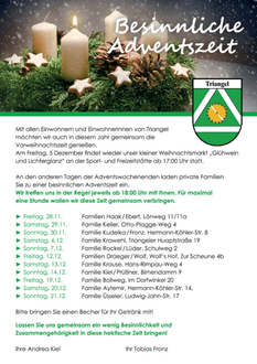auch in diesem Jahr möchten wir die schöne Tradition fortsetzen und laden herzlich zu unserer lebendigen Adventszeit in Triangel ein.