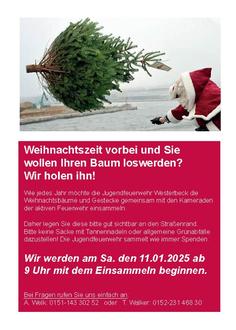 Die Mitglieder der Feuerwehr Westerbeck möchten wie gewohnt am zweiten Samstag im Januar die ausgedienten Weihnachtsbäume einsammeln. Beginn ist am Samstag, den 11.01.2025 um 9:00 Uhr, bitte bis dahin den Baum gut sichtbar und ohne Weihnachtsschmuck am Straßenrand ablegen. Auch wenn von uns eine direkte Anlieferung am Osterfeuerplatz stattfindet, können wir leider keine Gartenabfälle, Strauchgebinde oder Säcke mit Tannennadeln mitnehmen.