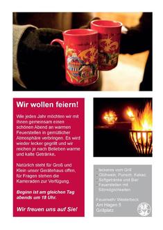 Wie jedes Jahr, findet wieder unser beliebtes Winterfeuer am Feuerwehrgerätehaus statt. Bei warmen Feuerstellen, heißen Getränken und leckeren Speisen zu moderaten Preisen, freuen wir uns auf nette Gespräche und einen tollen Abend mit Ihnen. Wie gewohnt steht die Fahrzeughalle für Groß und Klein offen, Fragen rund um die (Jugend-)Feuerwehr und zu unserer Technik werden sehr gern beantwortet. Beginn ist am gleichen Tag wie die Sammlung der Bäume, hinter der Feuerwehr „Am Hagen“, ab 18:00 Uhr.