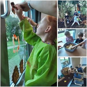 Auch in der grünen Gruppe wurde eine herbstliche Landschaft aufgebaut und dort wurde täglich gespielt und Geschichten nachgespielt, die sie zusammengelesen, gehört und gesehen haben.