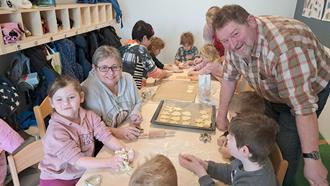 Die „Regenbogengruppe“ war voller fröhlicher Vorweihnachtsstimmung. Die Kinder waren so begeistert vom Plätzchen backen, dass sie sich kaum vom Teig ausrollen und die verschiedensten Formen ausstechen ablassen konnten. Sie wurden von ihren fleißigen Helfern unterstützt: Emmas Opa und Oma, Anna und Lias Tante und Amelies Mutter. Weihnachtsmusik im Hintergrund verlieh dem Ganzen noch mehr Charme und Freude.