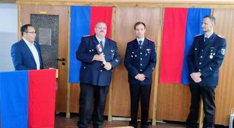 (von links: Bürgermeister Jochen Koslowski, Holger Bellwart, Henric Schreiber und stellv. Ortsbrandmeister Christian Lenz)