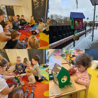 Nachdem das bunt bemalte Häuschen getrocknet war, haben wir uns gemeinsam in einem Kreis die Geschichte von der kleinen Meise angeschaut. Das Buch "Kleine Meise, kleine Meise" von Eulenspiegel Kinderbuch erzählt einfühlsam von den Schwierigkeiten, die Vögel im Winter beim Finden von Nahrung haben. Die Kinder ließen sich von der Geschichte inspirieren und durfte im Anschluss selbst Vogelfutter in das Vogelhäuschen legen. Nachdem das Häuschen mit ausreichend Futter befüllt war, wurde dieses draußen vor dem Gruppenraum aufgehangen.