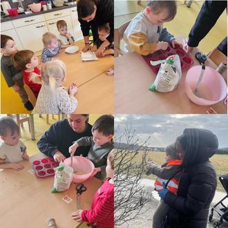 Täglich verfolgen die Kinder gespannt, ob sich gefiederte Besucher einfinden, welche sich an dem Futter erfreuen. Eine ideale Gelegenheit für die jungen Entdecker, die Natur aktiv zu erleben. Als weitere Einheit von unserem Projekt haben die Kinder gemeinsam mit einer Praktikantin Futterblöcke aus Kokosfett und Vogelfutter hergestellt. Diese wurden bei einem Spaziergang an verschiedenen Orten aufgehängt, um den gefiederten Freunden auch außerhalb der Kindertagesstätte zusätzliche Nahrungsquellen anzubieten. Bei dem Projekt zeigten die Kinder viel Freunde an den Aktivitäten.