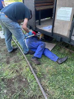 Das Technikteam um Thomas hatte umfangreiche Vorbereitungen getroffen, um die beiden Loks zu warten und einige Reparaturen durchzuführen zu können. Unter anderem mussten die Lager in Bauchlage geschmiert werden. Die Gleise zum Reparaturschuppen mussten freigekratzt werden. Alles in allem waren das körperlich anstrengende Arbeiten. Umso mehr freute man sich auf das traditionelle Spargelessen in der Gaststätte Ambiente in Westerbeck.