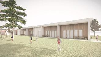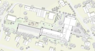 Inhaltlich wird der bestehende Baukörper in westlicher Richtung verlängert und durch einen Versatz aufgelockert sowie dabei die eingeschossige Bauweise beibehalten.