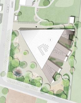 Inhaltlich wird dabei der bestehende dreieckige Gebäudekomplex an der östlichen Achse um Module in Holzbauweise erweitert.