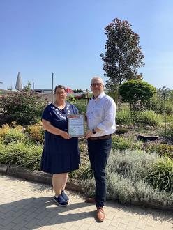 Die Freude über den Gewinn des Preises ist groß. Die AWO-Kindertagesstätte Westerbeck fühlt sich in ihrer pädagogischen Arbeit wertgeschätzt. Auf dem Bild ist die Übergabe des Preises durch Falk Hensel (Leiter des Geschäftsfeldes Familie & Soziale Dienste der AWO Braunschweig) zu sehen.