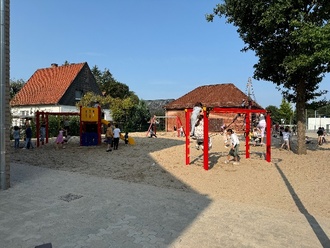 Im Anschluss an die Beendigung der Umbaumaßnahmen an der Kulturstätte (Alte Schule) konnte bereits kurz vor Ostern eine Doppelschaukel in der verbleibenden Sandspielfläche auf dem Schulhof der Findorff-Schule in Neudorf-Platendorf aufgestellt. Diese wurde gleich nach den Osterferien von den Kindern gerne und ausgiebig benutzt. Seitens der Bauverwaltung wurden die Sommerferien genutzt, um den Aufbau weiterer neuer Spielgeräte pünktlich abzuschließen, was für eine Riesenfreude bei den Schüler/-innen zum Schulstart sorgte. Hier entstanden ein Maxi-Klettergerüst mit Rutsche, eine Hangel, eine 4-sitzige Federwippe und im vorderen Bereich zur Brückgraben-Seite eine dreier Gruppe Hüpfplatten. Willkommener Nebeneffekt durch das nunmehr große Angebot an Spielmöglichkeiten ist eine Entzerrung der Gesamtsituation auf dem Schulhof.