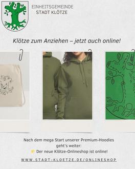 Ab sofort ist die Einheitsgemeinde Stadt Klötze mit einem eigenen Onlineshop vertreten. Unter dem Motto „Heimatgefühl zum Anziehen“ können Bürgerinnen, Bürger und Besucher der Region ab sofort T-Shirts, Hoodies, Beanies und weitere Artikel im typischen Klötze-Design bestellen.