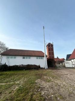 Stattdessen wurde die Sirene auf einem 12 Meter hohen Mast hinter dem Feuerwehrhaus – angrenzend zum Gutshof – installiert. Die Position wurde vor Ort gemeinsam abgestimmt und durch den Hersteller freigegeben.