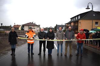 Mit dem Scherenschnitt gaben die Straße frei: (v.l.) D. Scherf, Stadt Klötze, F. Weigel LSBB, K. Ewertowski Stadtratsvorsitzender, B. Lange Wasserverband Klötze, A. Kleine, Bürgermeister, M. Thiesing STRABAG, M. Krüger ehem. Regionalbereichsltr. LSBB