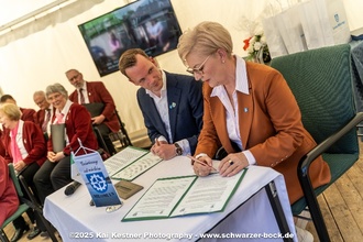 Unterschreiben der Jubiläumsvereinbarung Bürgermeister Kleine hat eine Jubiläumsplakette von