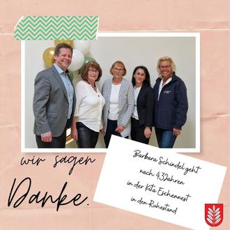 Am vergangenen Freitag verabschiedeten wir Barbara Schindel, die stellv. Leiterin der Kita Eschennest, nach 43 Jahren in unserer Escheder Kita in den wohlverdienten Ruhestand.