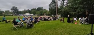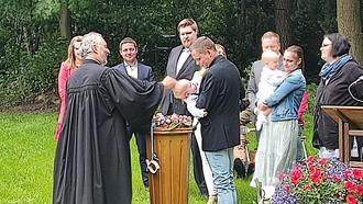 Freiluftgottesdienst. Der Gottesdienst fand an seinem neuen Platz, auf dem ehemaligen Beachsoccerfeld statt. Zu den Bänken wurden diesmal noch etliche bequemere Stühle für die älteren Besucher gestellt. Das Bläsercorps Beedenbostel war ebenfalls wieder mit von der Partie. Es ging mit einem schönen Intro los, bevor Pastor Gottschalk den Gottesdienst begann. Nach 2 gesungenen Liedern bat er zunächst die Familie Götze aus Lachendorf mit ihrer Tochter Enja Elaine und ihren Taufpaten nach vorn. Am Hand auflegen bei der Segnung ließ er sowohl Eltern als auch Taufpaten teilnehmen. Auch die zweite Taufe von Jason Elias Körtner aus Höfer wurde mithilfe der Taufpaten so durchgeführt.