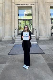 Mit dieser Aufgabenstellung hat sich Perdita Früh, Abiturientin am Immanuel-Kant-Gymnasium in Lachendorf, im Rahmen des 72. Europäischen Wettbewerb 2025 beschäftigt. Für das Thema ist Perdita durch ihr Engagement als stellvertretende Wahlvorsteherin bei der Europa- und der Bundestagswahl in ihrer Heimatgemeinde Wienhausen sensibilisiert worden. Da die sozialen Medien für immer mehr Menschen die einzige Informationsquelle darstellen, ist Desinformation auf diesen Kanälen eine Bedrohung für die Demokratie. Daher, so Perdita, sei Aufklärung sehr wichtig, um den eigenen Medienkonsum kritisch zu reflektieren und die Fähigkeit zu erlangen, mit Desinformation umzugehen. Im Rahmen des Wettbewerbs hat Perdita ein Magazin entworfen, das zentrale Fragen beantwortet: Was sind Desinformationen? Welche Akteure verbergen sich dahinter? Welche Ziele haben sie? Welche Maßnahmen ergreift die EU auf gesetzgeberischer Ebene gegen Desinformation? Und wie kann der Einzelne sich vor Desinformation schützen? Perdita hat in Printmedien und in geprüften digitalen Quellen zu der Thematik recherchiert und ihre Ergebnisse mit Design-Elementen anschaulich und ansprechend visuell gestaltet. Damit hat sie die hochrangige Jury vollauf überzeugt. Sie wurde für ihrem Beitrag, nicht nur mit einem Landespreis, sondern sogar mit einem Bundespreis ausgezeichnet. Diesen durfte sie in Form eines Reisepreises sowie einer Urkunde vor kurzem bei der feierlichen Preisverleihung im Niedersächsischen Landtag entgegennehmen.