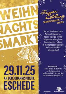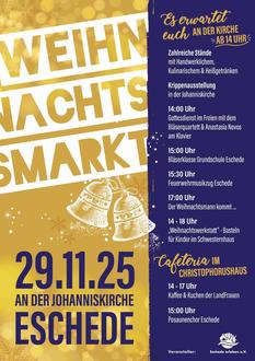 In diesem Jahr wird die Adventszeit wieder wie gewohnt stimmungsvoll eingeläutet … und das nicht nur durch den Klang der Glocken der Johanniskirche: im Turm und um das frisch renovierte Gotteshaus herum findet am 29. November in der Zeit von 14 – 21 Uhr der Escheder Weihnachtsmarkt statt.