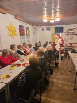 Eine kleine Überraschung bot sich den Gästen, gegen 16:30 Uhr, da der Weihnachtmann in seinem ganzen Weihnachtsstress noch Zeit gefunden hat, für einen kurzen Besuch der Stöckheimerinnen und Stöckheimer. Aus seinem Geschenkebeutel gab der Weihnachtsmann nur etwas heraus, wenn er zuvor ein kleines Weihnachtgedicht oder Weihnachtslied zu hören bekam. Diesem Wunsch kamen alle Gäste gemeinsam nach, indem zusammen Weihnachtslieder gesungen wurden und somit waren die Geschenke schnell an jeden einzelnen verteilt. Am Abend des Adventskaffeetrinkens, gab es dann noch für alle Gäste ein gemeinsames Abendessen. Somit konnte der Tag bei bester Stimmung und in geselliger Runde ausklingen, so dass es für alle wieder ein gelungener Nachmittag sowie Abend war.