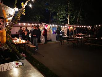 Ab 18.00 Uhr strömten Gäste aus nah und fern in unseren Park. An den urigen Ständen, die von dem Apenburger Andreas Schwieger kostenlos zur Verfügung gestellt wurden, war bei dem umfangreichen kulinarischen Angebot die Entscheidung schwierig. Buffets der 9. Klasse der Sekundarschule und der 12. Klasse des Gymnasiums, Pellkartoffeln aus einem rustikalen Dämpfer mit von Doreen Fäseke zubereitetem Quark, Hirschkalbgulasch aus dem Dutch-Oven, von Herrn Schwieger zubereitet, und Spieße vom Mangalgrill, angeboten vom Voltegierverein Beetzendorf-Käcklitz standen zur Auswahl. Kalte Getränke am Stand der DLRG, Wein und Käse beim Heimatverein, Cocktails und (witterungsbedingt) Glühwein und Punsch vom Jungen BEE der Gesunden Region ließen keinen Wunsch offen.