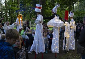 Im Dämmerlicht begannen die Attraktionen. Die Kinder sammelten sich zum Lampionumzug, der von beleuchteten Stelzenläufern angeführt wurde.