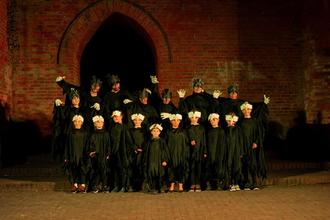 Danach begann die Krähenperformance, geleitet von Nicoletta Geiersbach und Sophie Willert, die durch eindrucksvolles Licht untermalt wurde. Die alten Krähen verlieren zum Schluss durch das optimistische, fröhliche Wirken der jungen Nachkommen ihre Trauer, ihre Sorgen, ihre dunkle Ausstrahlung und beginnen im gemeinsamen Tanz ein friedvolles Miteinander.