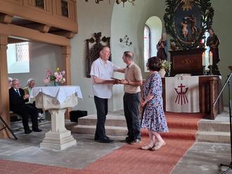 Am 22.06.2025 fand in der voll besetzen Rohrberger Kirche die Verabschiedung von Pfarrer Falko Schilling statt. Seit vier Jahren betreute er die 21 Predigtstellen des Pfarrbereiches Beetzendorf-Rohrberg. Gewohnt hat er mit seiner Frau im Pfarrhaus in Rohrberg. Nun wird Pfarrer Schilling die Altmark verlassen, um seinen wohl verdienten Ruhestand im Süden Sachsen-Anhalts zu verbringen. Im Pfarrhaus stapelten sich schon die Umzugskartons, als die Vorbereitungen für den letzten Gottesdienst seiner Amtszeit liefen. Geschirr wurde vom Gemeinderaum in die Kirche getragen, denn nach dem Gottesdienst sollten alle noch beim Kirchenkaffee zusammen sein. Die Besucher erlebten einen sehr emotionalen Gottesdienst, bei dem so manche Träne floss. In den Reihen saßen unter vielen Vertretern der 21 Dörfer auch seine Amtskollegen wie Pfarrer Henke, der den Gottesdienst aktiv mitgestaltete, Pfarrer Silvio Scholz aus Dähre, der ebenfalls am Tag zuvor seine Verabschiedung beging, Pfarrerin Frau Eichenberg, die ein Teil der Vertretung übernehmen wird, Pfarrer Steffen Kiesner-Barth aus Osterwohle und später Pfarrer Storck aus Diesdorf. In der Predigt lies Pfarrer Schilling sein Leben als Pfarrer Revue passieren. Auf acht Dienststellen konnte er verweisen. Das bedeutet auch acht Umzüge und somit hat er jede Menge Erfahrung in dem, was der Familie wieder unmittelbar bevorstand. Er berichtete unter anderem vom Gemeindehaus Beetzendorf, was nach mehreren Anläufen mit seiner Unterstützung den Zuschlag für 200.000 € Leader-Förderung vor Kurzem erhalten hat. Es bleibt spannend, wie es umgesetzt wird. Des Weiteren hob er die schweren Jahre seiner Erkrankung hervor, durch die Gott ihn getragen hat. Ein neues Leben wurde ihm durch eine Organtransplantation geschenkt. Die Anwesenden rief er auf, sich dieser Thematik zu stellen und selber die Bereitschaft zur Organspende zu überdenken und zu handeln. Er bekam eine zweite Chance zu leben und hat dieses Geschenk dankbar angenommen. Er beendete seine Predigt mit Dankesworten an seine Frau, seine Familie, die Gemeindekirchenräte, Kirchenmitarbeiter und Kirchenglieder, die ihn alle begleitet haben. Am Ende hatten alle Gelegenheit sich bei ihm mit Worten und Geschenken zu bedanken, wovon reichlich Gebrauch gemacht wurde. Gern folgten die Anwesenden der Einladung zu Kaffee und Kuchen in der Kirche und noch manches Gespräch wurde in lockerer Atmosphäre geführt.