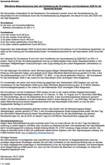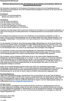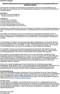 Gegenüber dem Kalenderjahr 2025 ist damit keine Änderung für Grundsteuer A und Hundesteuer eingetreten, so dass auf die Erteilung der Grundsteuerbescheide-/ Hundesteuerbescheide für das Kalenderjahr 2026 verzichtet wird.