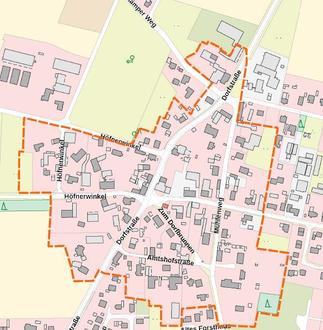Der Geltungsbereich orientiert sich am historisch gewachsenen Ortskern, welcher entlang folgender Straßenzüge verortet werden kann: Dorfstraße, Mühlenweg, Höfnerwinkel und Sandlinger Straße, Amtshofstraße. Der Geltungsbereich ist nachfolgend dargestellt (unmaßstäblich)