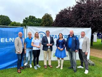 Frank Böse (Bürgermeister Flotwedel), Stefan Koschick (CeBus), Carolina Kühn (Kreissportbund Celle), Landrat Axel Flader, Claudia Sommer (Samtgemeindebürgermeisterin), Holger Schwenke (SVO) und Dirk Suhrkamp (Sparkasse Celle-Gifhorn-Wolfsburg)